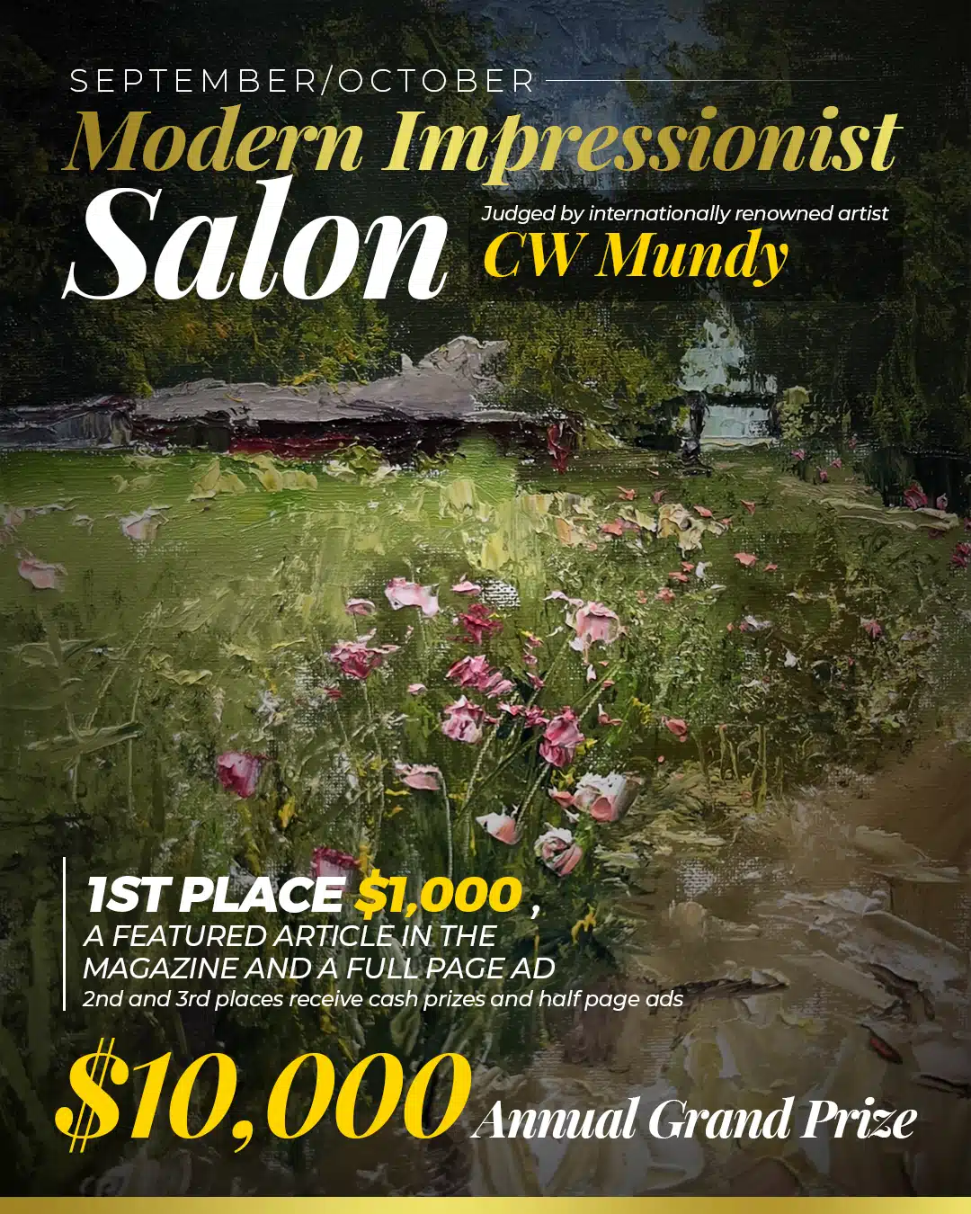 We have raised both the monthly and annual grand prize money for the Modern Impressionist Salon. The monthly 1st place prize will be $1,000 and the Grand Prize will be $10,000 This month’s Salon is judged by renowned artist C.W. Mundy. We are very excited about the great art we are receiving from so many talented artists. We hope to see your work!